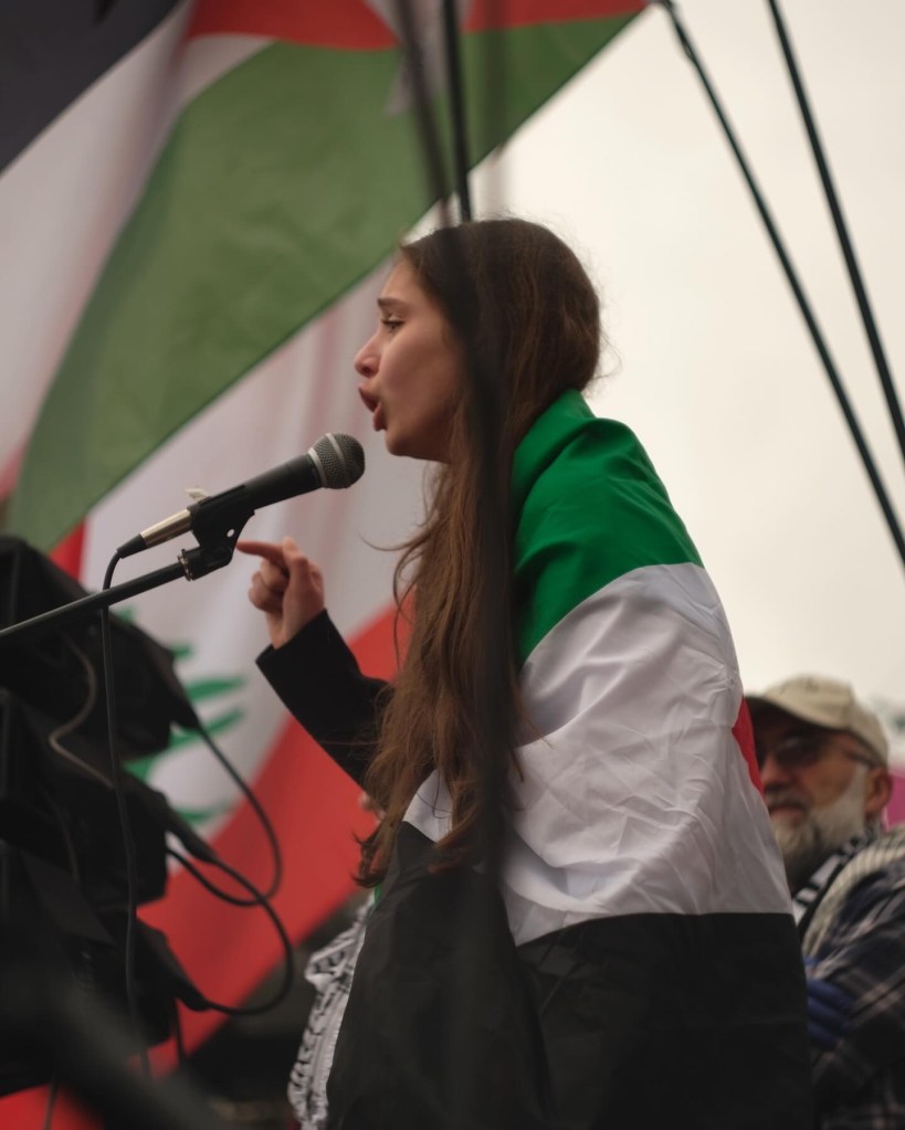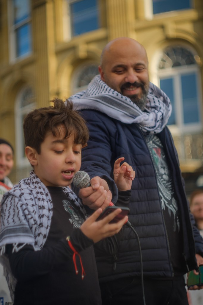 Then I heard, “Bi ruh bi dam nafdika ya Falastine.” Arabic I knew.