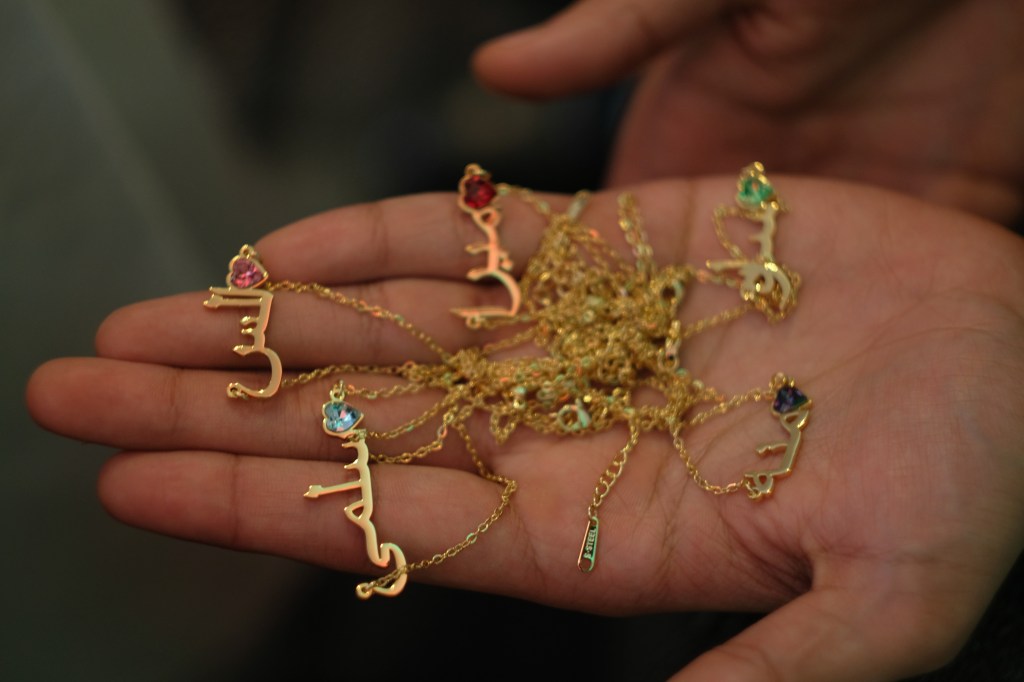 Omar showed off necklaces he got for his nieces in Gaza; he’s still not been able to give them to them.