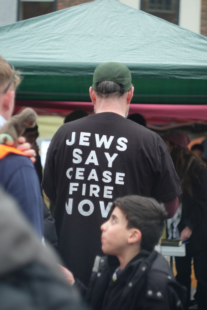 In a corner, I hear an English chant from the river to the sea.
